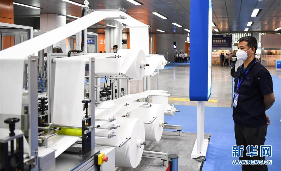 6月10日拍攝的展會上的一臺口罩生產(chǎn)設(shè)備。當(dāng)日,廣州國際防疫物資展覽會在保利世貿(mào)博覽館舉行。本次展會面積共計(jì)3.6萬平方米,設(shè)有防疫產(chǎn)品、設(shè)備、綜合服務(wù)、原輔料等4個展區(qū),參展企業(yè)約600家。新華社記者鄧華攝