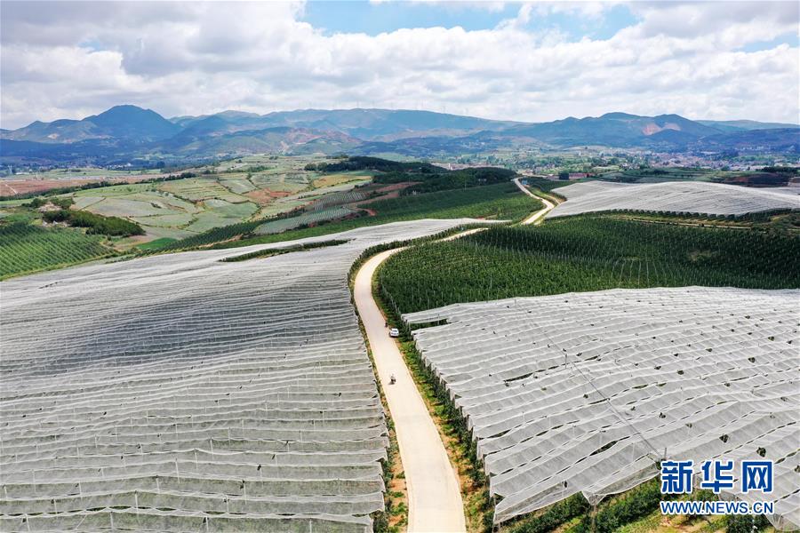這是6月11日拍攝的貴州省威寧縣一處蘋果基地(無(wú)人機(jī)照片)。近日,貴州省威寧彝族回族苗族自治縣的農(nóng)民搶抓農(nóng)時(shí),對(duì)蘋果園進(jìn)行疏果、除草等田間管理,呈現(xiàn)出一派夏管農(nóng)忙景象。威寧縣蘋果種植面積50余萬(wàn)畝,蘋果產(chǎn)業(yè)已逐步成為當(dāng)?shù)剞r(nóng)民增收致富的主導(dǎo)產(chǎn)業(yè)之一。新華社記者楊文斌攝。
