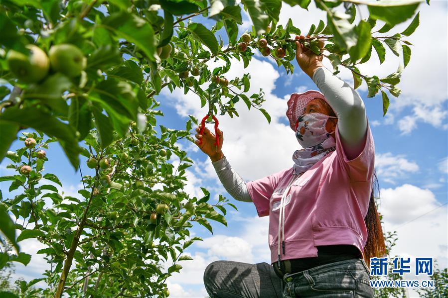 6月11日,農(nóng)民在貴州省威寧縣一處蘋果基地里疏果。近日,貴州省威寧彝族回族苗族自治縣的農(nóng)民搶抓農(nóng)時,對蘋果園進行疏果、除草等田間管理,呈現(xiàn)出一派夏管農(nóng)忙景象。威寧縣蘋果種植面積50余萬畝,蘋果產(chǎn)業(yè)已逐步成為當(dāng)?shù)剞r(nóng)民增收致富的主導(dǎo)產(chǎn)業(yè)之一。新華社記者楊文斌攝。