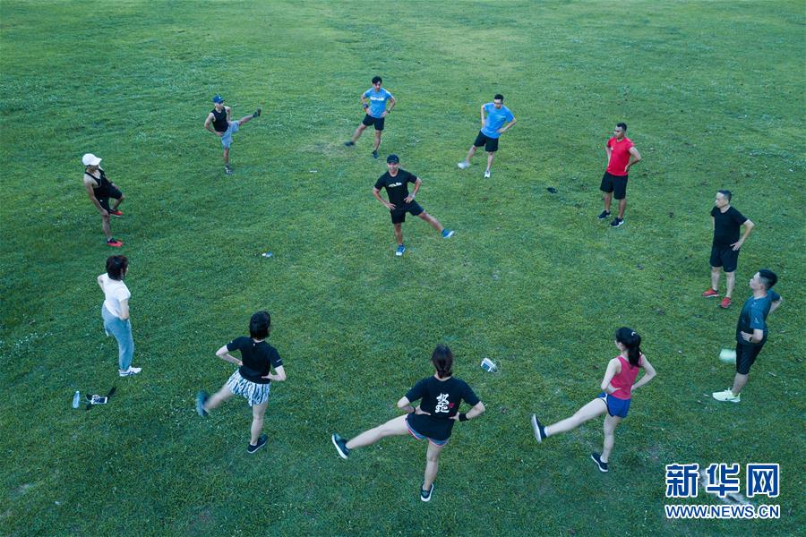 6月11日傍晚,在??谌f(wàn)綠園,市民在夜跑前做熱身運(yùn)動(dòng)(無(wú)人機(jī)拍攝)。近年來(lái),夜跑成為越來(lái)越多都市人熱衷的健身方式之一。在海南???,每當(dāng)夜幕降臨,“夜跑族”來(lái)到??谌f(wàn)綠園、世紀(jì)公園等夜跑場(chǎng)所跑步,用一身酣暢淋漓的汗水?dāng)[脫白天工作中的壓力,享受跑步帶來(lái)的歡愉。新華社記者 蒲曉旭 攝