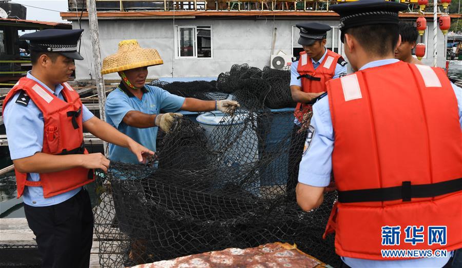 6月13日,海南省公安廳海岸警察總隊(籌備組)陵水支隊民警幫助轄區(qū)內(nèi)漁民整理漁網(wǎng)。當日,海南省氣象局于16時30分繼續(xù)發(fā)布臺風四級預警。今年第2號臺風“鸚鵡”(熱帶風暴級)預計于14日在廣東沿海登陸。新華社記者楊冠宇攝。
