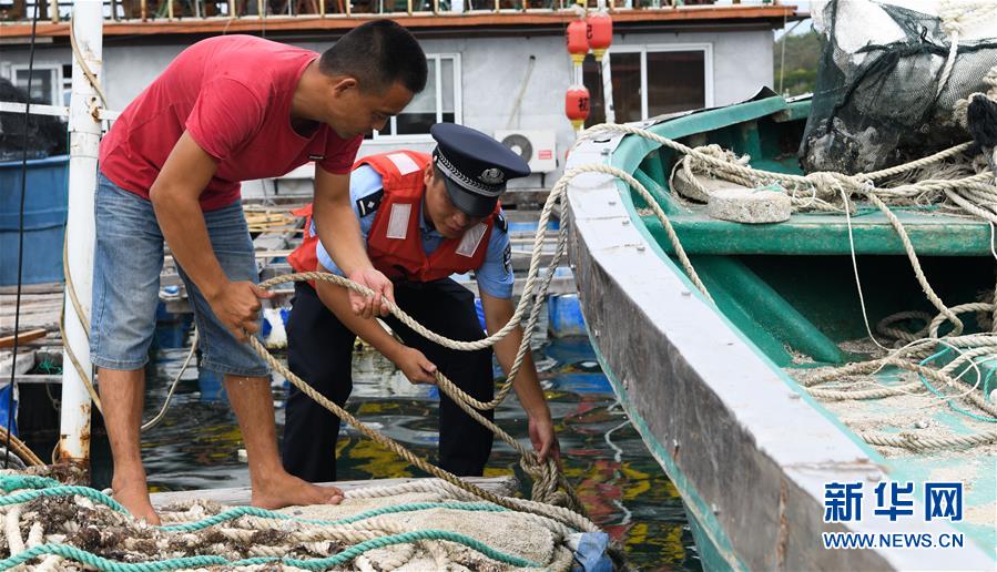 6月13日,海南省公安廳海岸警察總隊(籌備組)陵水支隊民警幫助轄區(qū)內(nèi)漁民固定漁排。當日,海南省氣象局于16時30分繼續(xù)發(fā)布臺風四級預警。今年第2號臺風“鸚鵡”(熱帶風暴級)預計于14日在廣東沿海登陸。新華社記者楊冠宇攝。