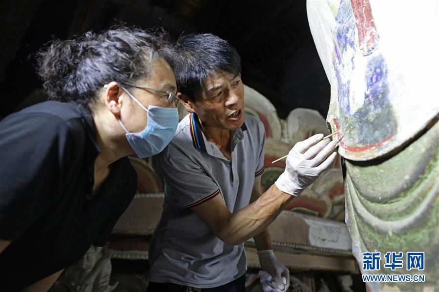 6月8日,工作人員對奉國寺的彩繪泥塑進行保護修復(fù)。新華社記者 姚劍鋒 攝