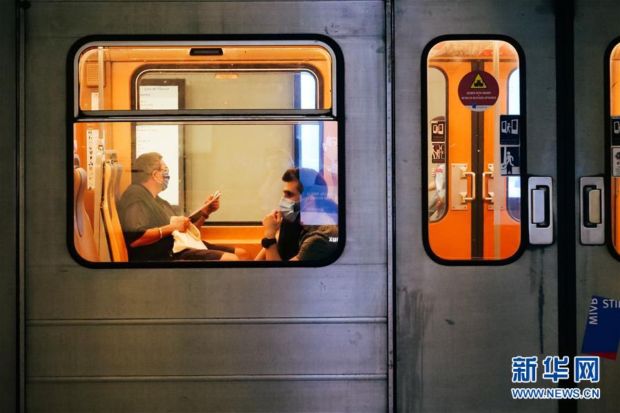 6月13日,乘客戴口罩在比利時布魯塞爾乘坐地鐵。新華社記者 張鋮 攝
