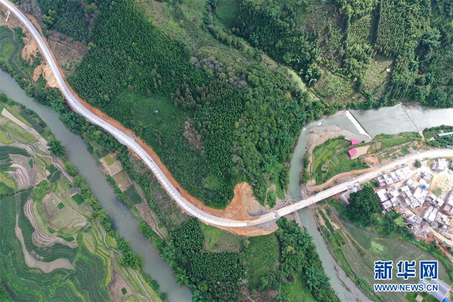 正在建設(shè)的百坭村二級公路(6月17日攝,無人機照片)。
