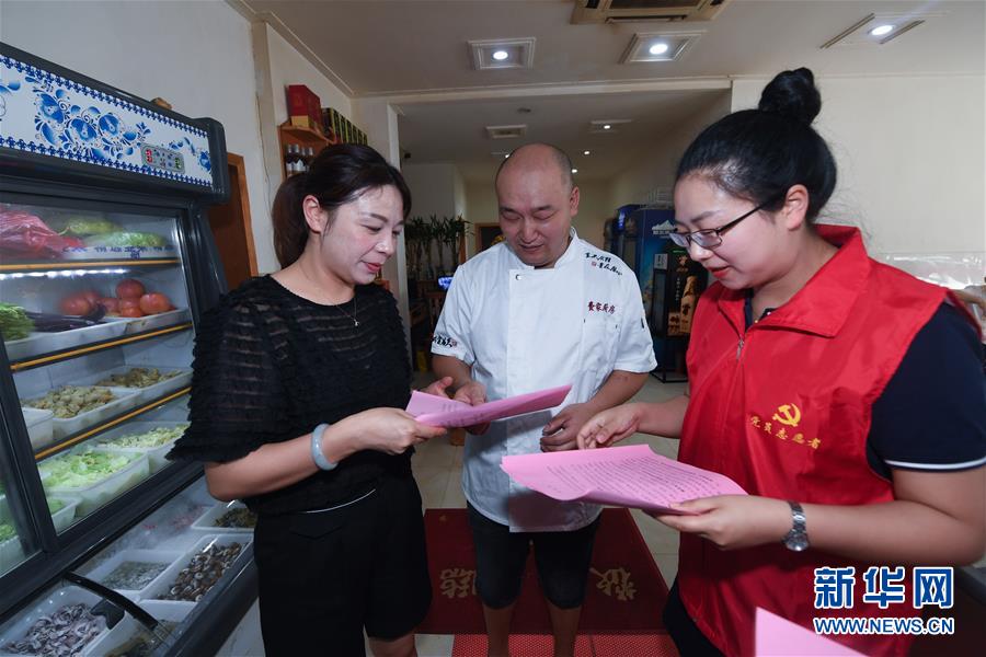6月17日,黨員志愿者(右)在東林鎮(zhèn)一家農(nóng)家樂(lè)內(nèi)給經(jīng)營(yíng)戶(hù)發(fā)放野生動(dòng)物保護(hù)及禁食倡議書(shū)。新華社記者 徐昱 攝