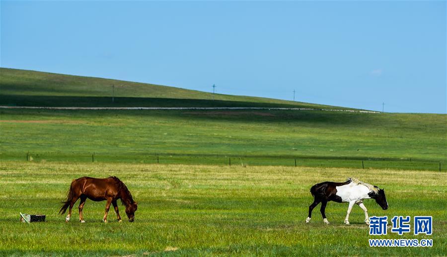 6月17日,馬兒在錫林郭勒盟烏拉蓋草原上吃草。初夏時節(jié),內(nèi)蒙古中部的錫林郭勒大草原風景如畫。新華社記者連振攝