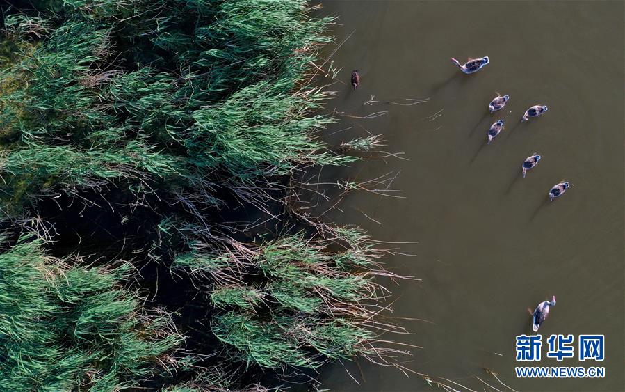 6月19日,一群鴨子在新疆烏倫古湖國家濕地公園覓食(無人機照片)。烏倫古湖國家濕地公園位于新疆阿勒泰地區(qū)福海縣城以西,由烏倫古湖和吉力湖兩部分組成。烏倫古湖濕地公園是遷徙候鳥飛越天山和阿爾泰山的“能量補充站”,良好的濕地生態(tài)吸引著大量遷徙鳥類在此集結(jié)成群,繁殖棲息,成為一道靚麗的風(fēng)景線。新華社記者 沙達提 攝