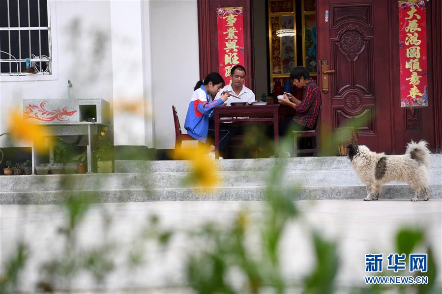 6月19日,在金寨縣三合實驗學校,蔡齊艷和同學一起吃午飯。新華社記者張端攝
