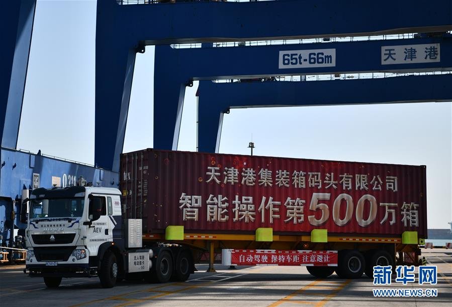 在天津港集裝箱碼頭有限公司北區(qū)智能碼頭自動(dòng)化堆場(chǎng),裝載著集裝箱的無(wú)人駕駛電動(dòng)集裝箱卡車(chē)向碼頭駛?cè)ィ?019年9月26日攝)。新華社記者李然攝