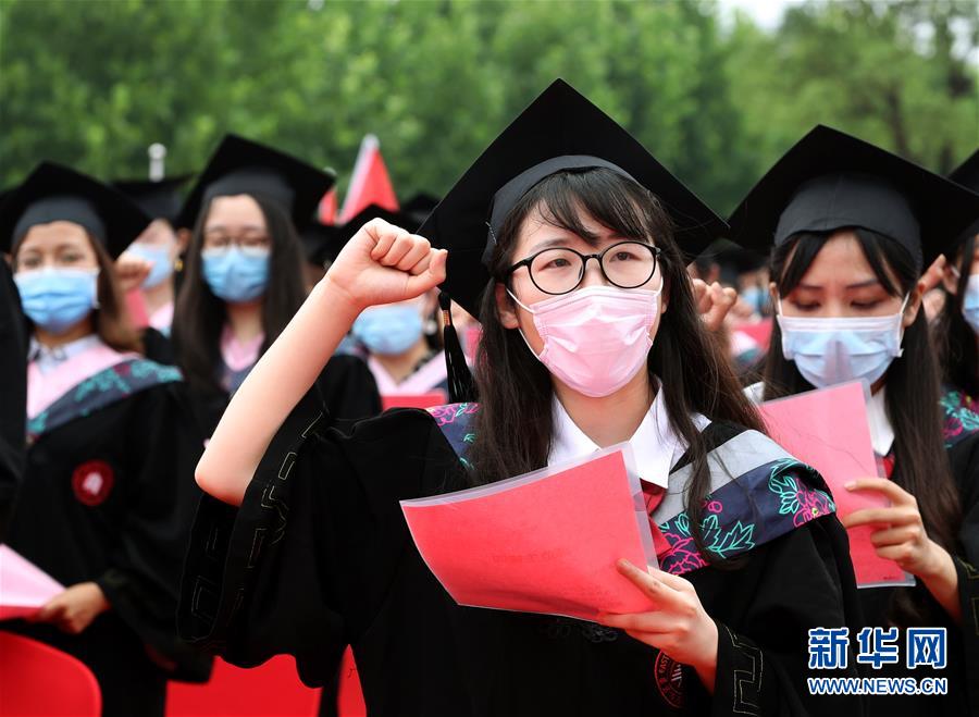 6月23日,在華東師范大學(xué)閔行校區(qū)的畢業(yè)典禮上,師范專業(yè)的畢業(yè)生舉行宣誓儀式。當日,華東師范大學(xué)舉行2020屆畢業(yè)典禮。由于疫情防控需要,今年的典禮在兩個校區(qū)分別舉辦,并全程在線直播。約7700名華東師范大學(xué)2020屆畢業(yè)生通過現(xiàn)場或“云端”的方式參加畢業(yè)典禮。新華社記者劉穎攝