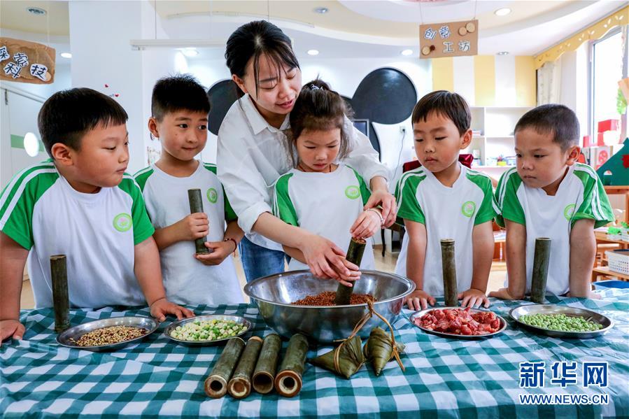 6月23日,長興縣李家巷鎮(zhèn)中心幼兒園的孩子們?cè)诶蠋煹膸ьI(lǐng)下,一起學(xué)習(xí)制作端午粽子和竹筒飯。為了迎接即將到來的端午節(jié),浙江省湖州市長興縣各個(gè)幼兒園開展“品民俗迎端午”主題活動(dòng),讓小朋友們體驗(yàn)傳統(tǒng)民俗文化。新華社記者徐昱攝