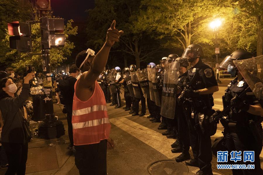 6月22日,警察和示威者在美國華盛頓白宮附近對峙。美國警察和示威者22日晚在首都華盛頓市白宮北側拉斐特廣場發(fā)生沖突并對峙。美國總統(tǒng)特朗普在社交媒體上說,許多人因破壞廣場上美國前總統(tǒng)安德魯·杰克遜的雕像及附近圣約翰圣公會教堂被逮捕。新華社記者劉杰攝