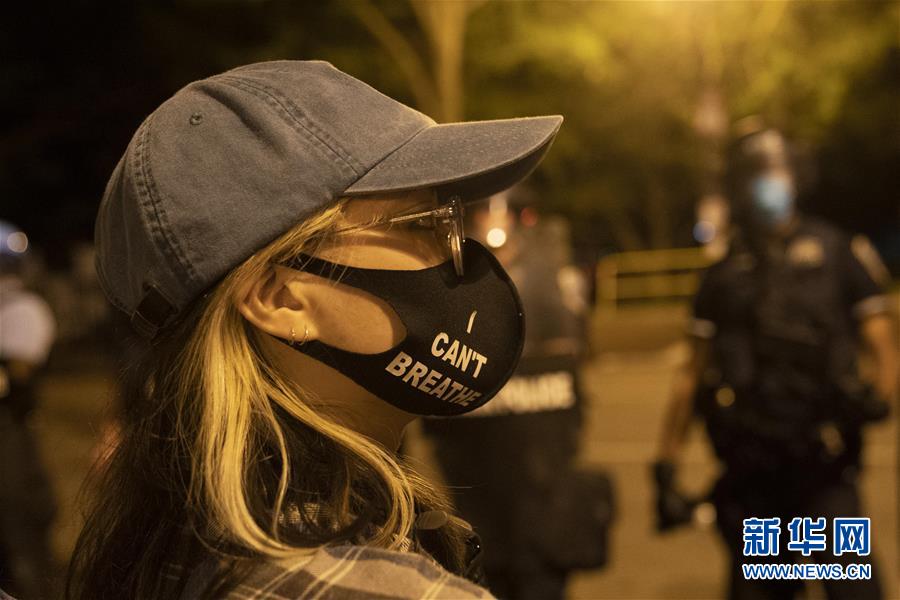 6月22日,一名女子戴著寫有“我不能呼吸”的口罩在美國(guó)華盛頓白宮附近參加示威活動(dòng)。美國(guó)警察和示威者22日晚在首都華盛頓市白宮北側(cè)拉斐特廣場(chǎng)發(fā)生沖突并對(duì)峙。美國(guó)總統(tǒng)特朗普在社交媒體上說,許多人因破壞廣場(chǎng)上美國(guó)前總統(tǒng)安德魯·杰克遜的雕像及附近圣約翰圣公會(huì)教堂被逮捕。新華社記者劉杰攝