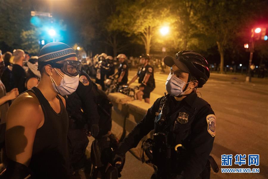 6月22日,警察和示威者在美國(guó)華盛頓白宮附近對(duì)峙。美國(guó)警察和示威者22日晚在首都華盛頓市白宮北側(cè)拉斐特廣場(chǎng)發(fā)生沖突并對(duì)峙。美國(guó)總統(tǒng)特朗普在社交媒體上說,許多人因破壞廣場(chǎng)上美國(guó)前總統(tǒng)安德魯·杰克遜的雕像及附近圣約翰圣公會(huì)教堂被逮捕。新華社記者劉杰攝