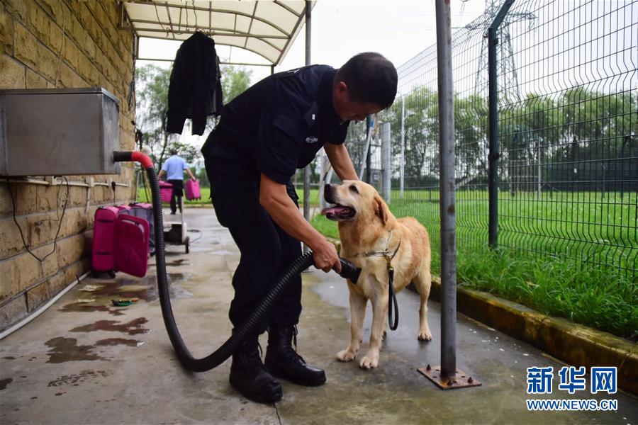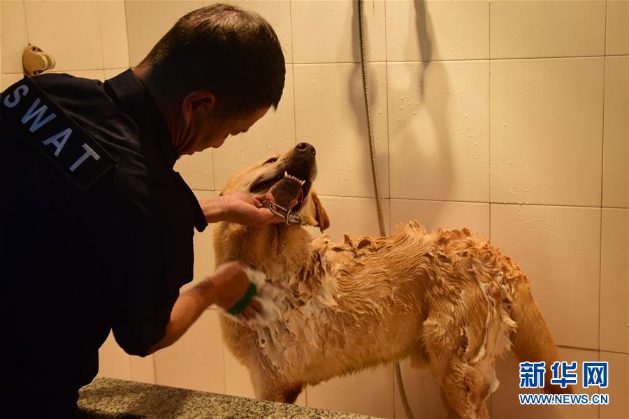 6月24日,訓(xùn)導(dǎo)員周吉榮為緝毒犬“多多”洗澡。 新華社記者 鄭夢雨 攝