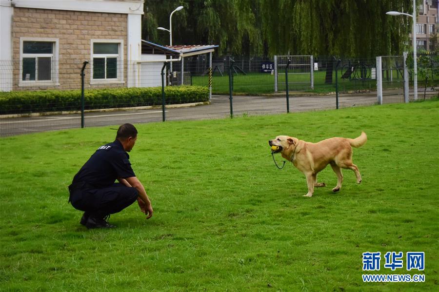 6月24日,訓(xùn)導(dǎo)員周吉榮調(diào)教緝毒犬“多多”。新華社記者 鄭夢雨 攝