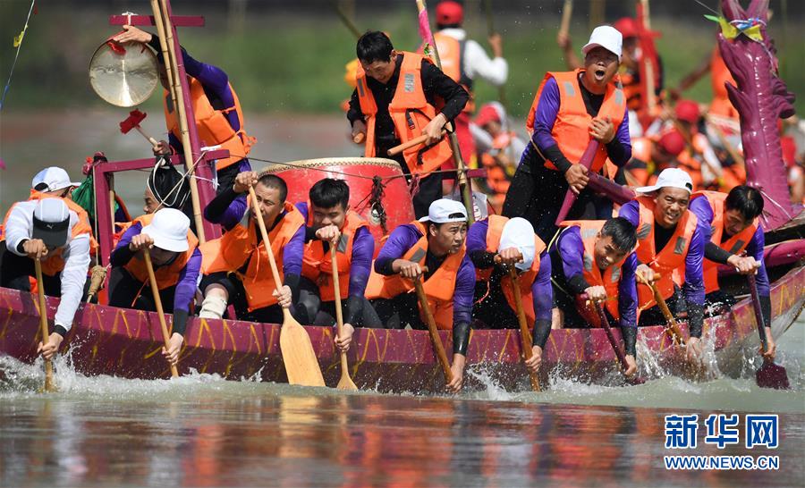 6月25日,參賽龍舟隊在比賽中。當(dāng)日是農(nóng)歷五月初五,是中國民間的傳統(tǒng)節(jié)日端午節(jié)。陜西省安康市第20屆龍舟節(jié)在漢江上舉行。每年端陽節(jié)前后,安康沿江一帶的縣區(qū)都舉行龍舟賽,賽龍舟成為民間自發(fā)的盛大活動。新華社記者 陶明 攝