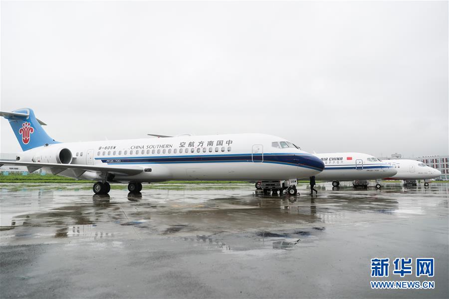 6月28日,嶄新涂裝的國產(chǎn)新支線客機ARJ21飛機停放在中國商用飛機有限責(zé)任公司總裝基地內(nèi)。當日,三架嶄新涂裝的國產(chǎn)新支線客機ARJ21飛機在位于上海浦東的中國商用飛機有限責(zé)任公司總裝基地集結(jié),分別交付給國航、東航、南航三大航空公司,標志著ARJ21進入我國主流民航市場。新華社記者丁汀攝