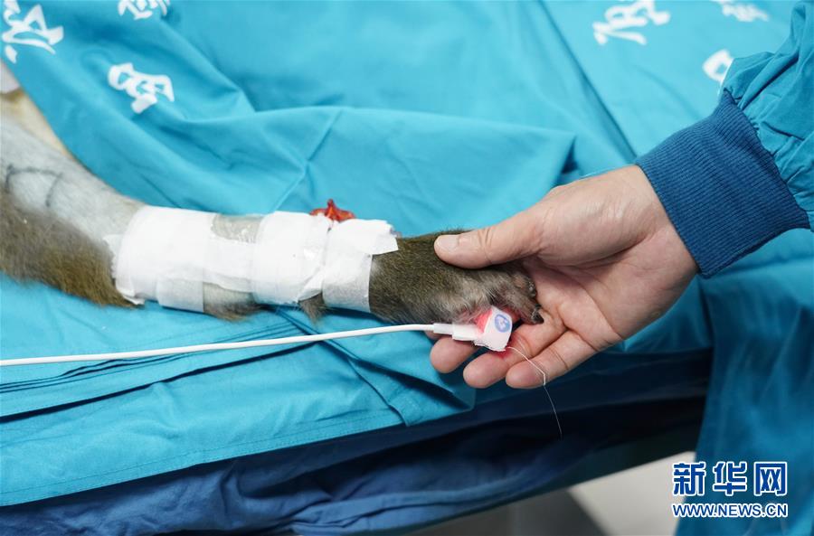 6月29日,研究人員在病房內(nèi)為移植肝受體猴按摩手部。日前,多基因編輯豬-恒河猴異種肝、心、腎器官移植在位于陜西西安的空軍軍醫(yī)大學(xué)西京醫(yī)院順利實(shí)施。研究團(tuán)隊(duì)使用豬內(nèi)源性逆轉(zhuǎn)錄病毒(PERV)敲除的13個基因修飾豬作為供體,將一個供體豬的肝、心、腎分別移植給3只恒河猴受體。目前,移植肝和對應(yīng)的受體猴已存活16天,突破國際上的豬-猴輔助性肝移植最長存活時間記錄。這項(xiàng)研究有助于未來解決器官短缺造成的臨床器官移植發(fā)展受限難題。新華社記者邵瑞攝