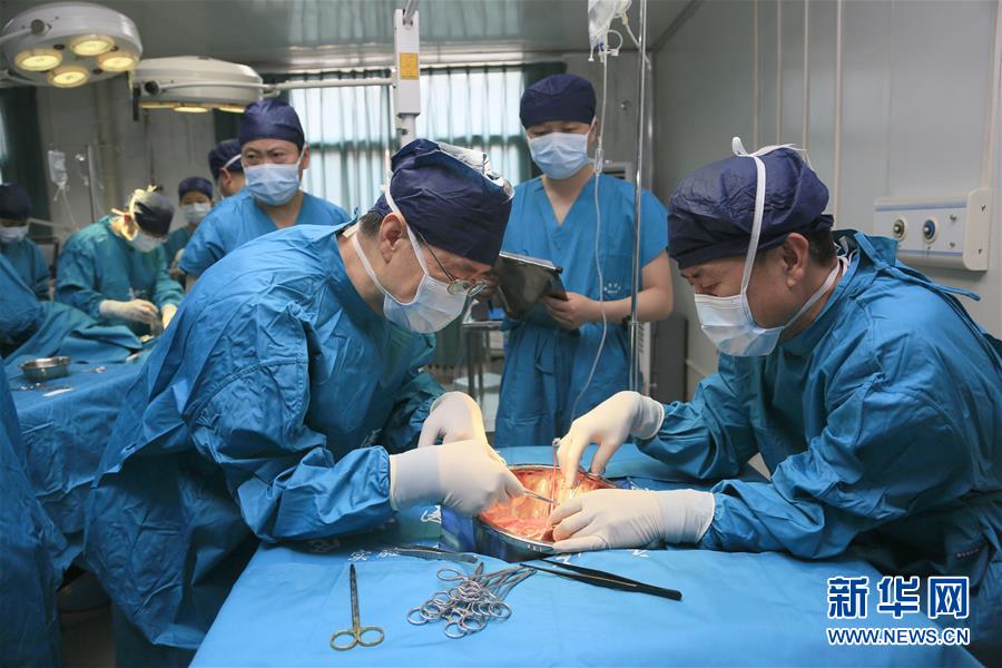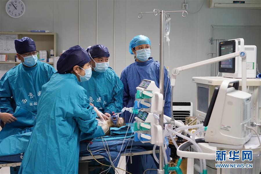 豬-猴異種肝心腎器官移植手術(shù)現(xiàn)場(6月13日攝)。日前,多基因編輯豬-恒河猴異種肝、心、腎器官移植在位于陜西西安的空軍軍醫(yī)大學(xué)西京醫(yī)院順利實(shí)施。研究團(tuán)隊(duì)使用豬內(nèi)源性逆轉(zhuǎn)錄病毒(PERV)敲除的13個基因修飾豬作為供體,將一個供體豬的肝、心、腎分別移植給3只恒河猴受體。目前,移植肝和對應(yīng)的受體猴已存活16天,突破國際上的豬-猴輔助性肝移植最長存活時間記錄。這項(xiàng)研究有助于未來解決器官短缺造成的臨床器官移植發(fā)展受限難題。新華社發(fā)(張懿楠攝)