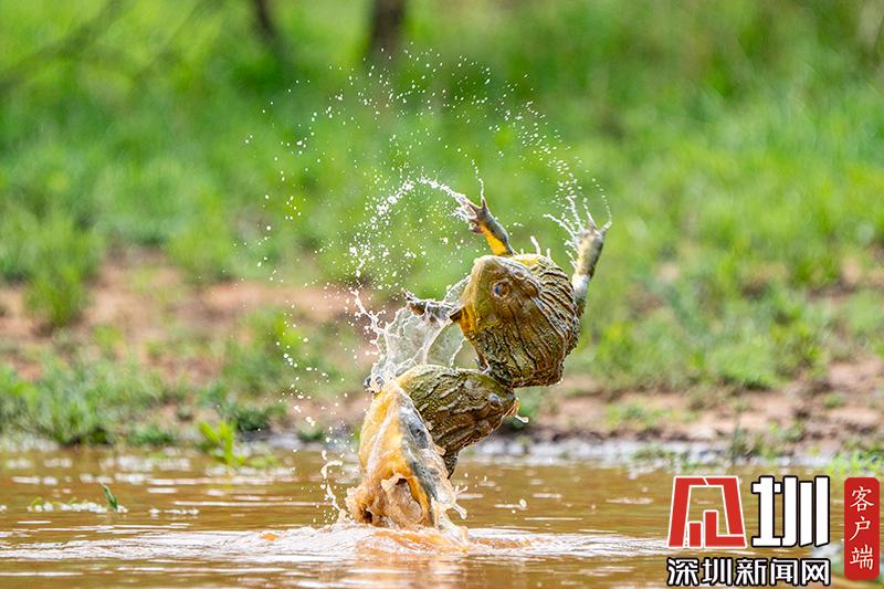 2020年6月30日?qǐng)?bào)道(具體拍攝時(shí)間不詳),南非波羅克瓦克,兩只雄性非洲牛蛙為了爭奪雌性牛蛙,在池塘中打架,這樣的情形十分罕見。畫面中,戰(zhàn)況十分激烈,一只非洲牛蛙在另外一只試圖逃到池塘邊緣時(shí)撕咬對(duì)手,甚至將另外一只拋向空中。這些精彩的照片是由南非開普敦?cái)z影師Temujin Johnson拍攝的。