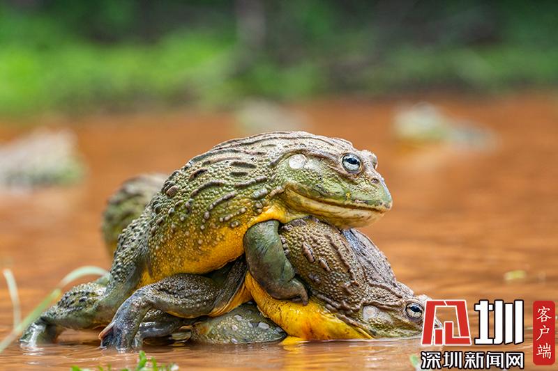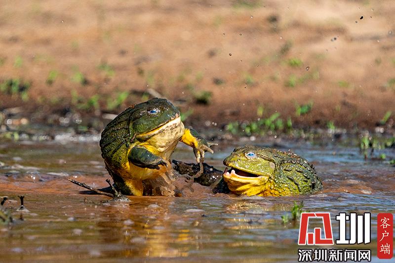2020年6月30日?qǐng)?bào)道(具體拍攝時(shí)間不詳),南非波羅克瓦克,兩只雄性非洲牛蛙為了爭(zhēng)奪雌性牛蛙,在池塘中打架,這樣的情形十分罕見。畫面中,戰(zhàn)況十分激烈,一只非洲牛蛙在另外一只試圖逃到池塘邊緣時(shí)撕咬對(duì)手,甚至將另外一只拋向空中。這些精彩的照片是由南非開普敦?cái)z影師Temujin Johnson拍攝的。