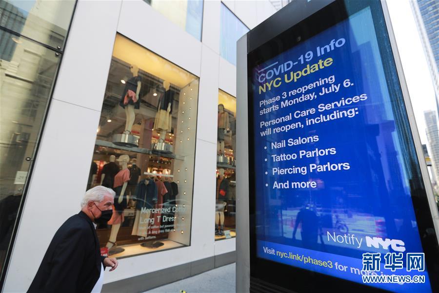 7月4日,一名行人從美國紐約第五大道顯示新冠疫情最新情況的信息屏旁經(jīng)過。當日是美國獨立日,美國多地疫情仍面臨嚴峻形勢。美國約翰斯·霍普金斯大學(xué)實時統(tǒng)計數(shù)據(jù)顯示,美國累計新冠確診病例4日已超過280萬例。新華社記者王迎攝