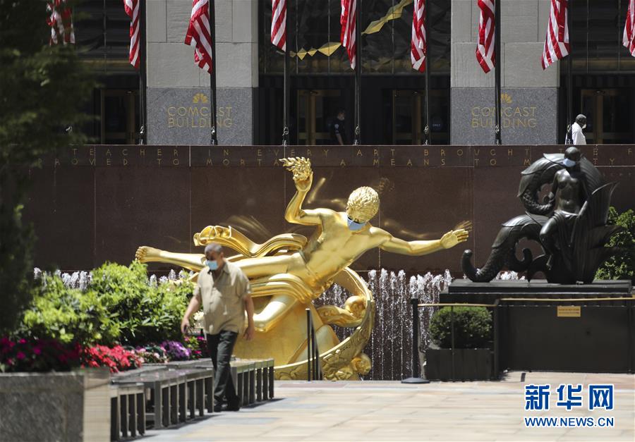 7月4日,一名男子從美國紐約洛克菲勒中心一尊戴口罩的雕像前走過。當日是美國獨立日,美國多地疫情仍面臨嚴峻形勢。美國約翰斯·霍普金斯大學(xué)實時統(tǒng)計數(shù)據(jù)顯示,美國累計新冠確診病例4日已超過280萬例。新華社記者王迎攝
