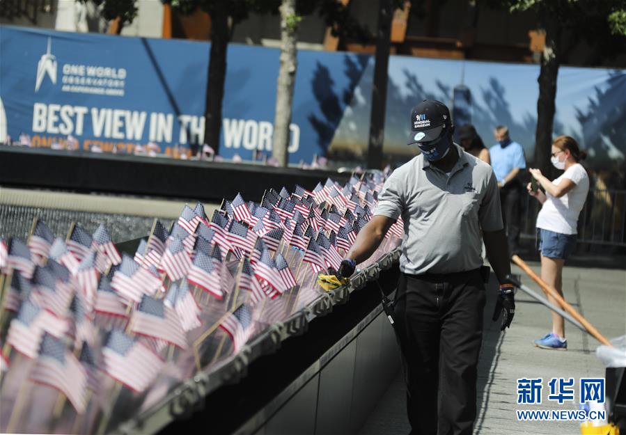 7月4日,工作人員在當日重新開放的美國紐約“9·11”世貿(mào)中心遺址做清潔。當日是美國獨立日,美國多地疫情仍面臨嚴峻形勢。美國約翰斯·霍普金斯大學(xué)實時統(tǒng)計數(shù)據(jù)顯示,美國累計新冠確診病例4日已超過280萬例。新華社記者王迎攝