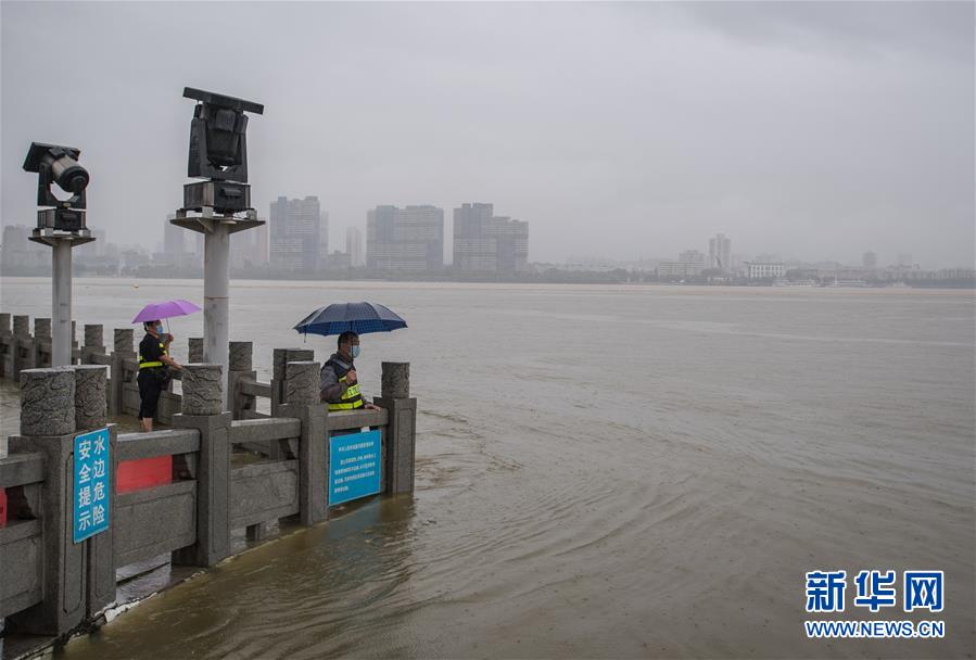 7月6日,工作人員在武漢龍王廟觀察水情。記者6日從武漢市防汛抗旱指揮部辦公室獲悉,5日以來,武漢遭暴雨襲擊,全市多處路段漬水。至6日4時,長江漢口站超設(shè)防水位1.79米,漢江新溝站超警戒水位0.01米。鑒于當前水雨汛情和漬澇情況,武漢市從6日5時起,將排澇應急響應級別提升至Ⅱ級;從6時30分起,將防汛應急響應級別提升至Ⅱ級。新華社記者肖藝九攝