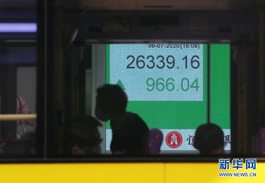 7月6日,人們從位于香港中環(huán)的股市信息屏前經(jīng)過。香港恒生指數(shù)6日漲966.04點(diǎn),漲幅3.81%,收報26339.16點(diǎn)。全日主板成交2507.97億港元。新華社記者李鋼攝