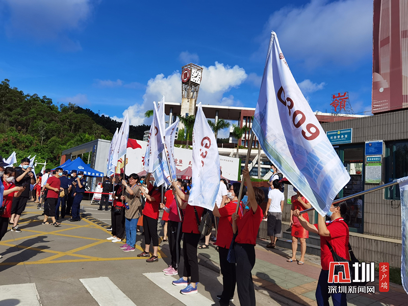 深圳紅嶺中學(xué)高三各班級家長代表組成的家長委員會,在門口為高三考生助威加油。