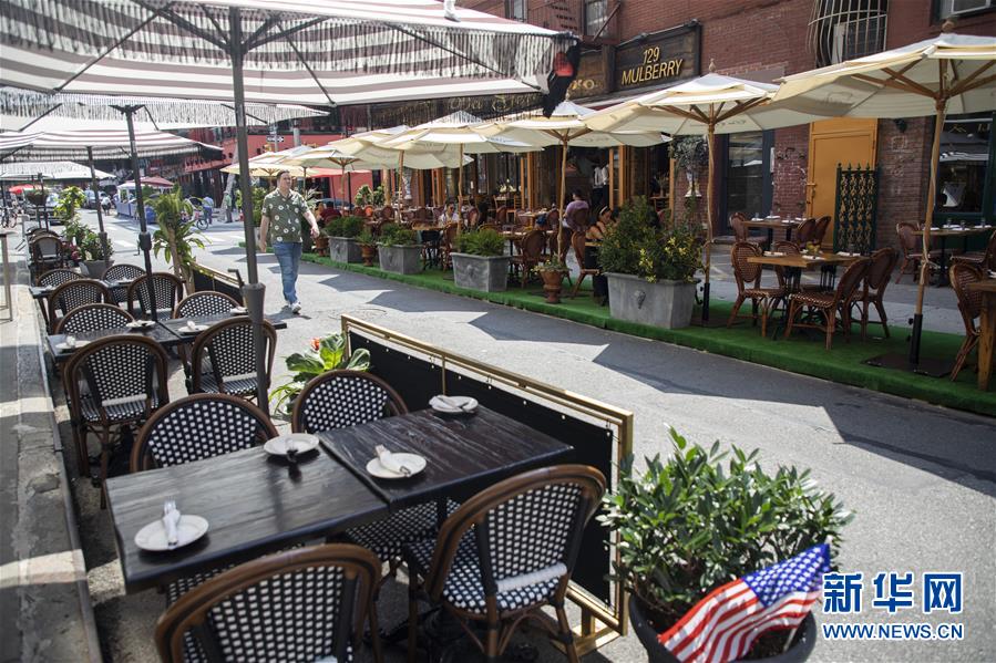 7月6日,一名男子從美國(guó)紐約一家餐廳的戶外餐區(qū)旁經(jīng)過(guò)。當(dāng)天,紐約進(jìn)入重啟第三階段,美甲店、按摩店等個(gè)人護(hù)理業(yè)在經(jīng)歷近4個(gè)月的停業(yè)后被允許重新開(kāi)放。因防疫需要,原本應(yīng)在第三階段開(kāi)放的餐飲業(yè)室內(nèi)就餐仍處于暫停狀態(tài)。新華社記者王迎攝
