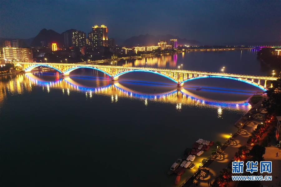 這是融安縣城夜色(7月7日攝,無人機照片)。夏夜的廣西融安縣城燈火璀璨,景色迷人。新華社記者張愛林攝