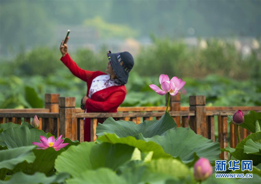 7月7日,游客在唐山市南湖公園內(nèi)的觀荷棧橋上拍照。近日,河北省唐山市南湖公園內(nèi)荷花競相綻放,呈現(xiàn)出“接天蓮葉無窮碧,映日荷花別樣紅”的美麗景象,吸引了眾多游客前來觀賞。新華社記者楊世堯攝