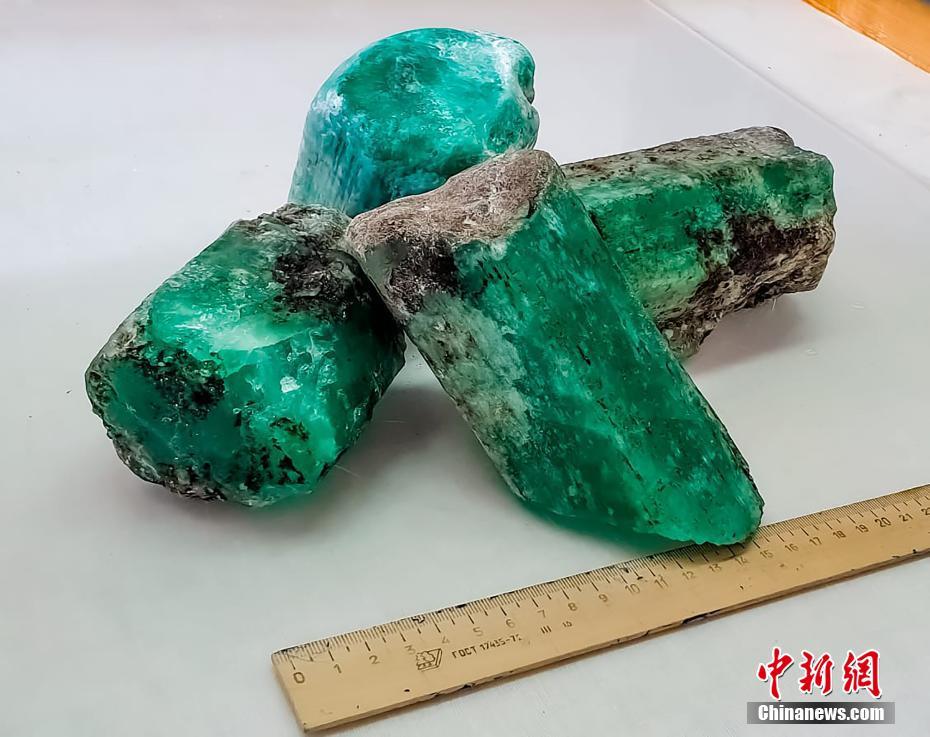 當(dāng)?shù)貢r(shí)間7月7日,俄羅斯斯維爾德洛夫斯克州,俄羅斯國(guó)家技術(shù)集團(tuán)在馬林斯克礦區(qū)內(nèi)發(fā)現(xiàn)總重量達(dá)4.8公斤的4塊綠寶石,是最近20年來(lái)發(fā)現(xiàn)的同類品質(zhì)中最大的寶石。圖片來(lái)源:視覺中國(guó)