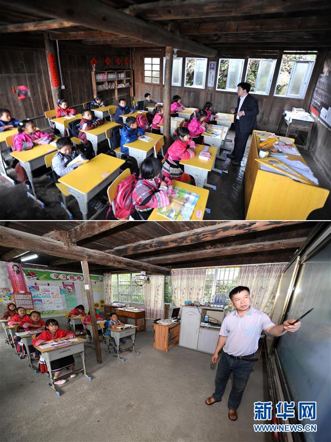 這是一張拼版照片,上圖:在廣西龍勝龍脊鎮(zhèn)江柳村翁江小學,余啟貴老師在給學生上課(2013年2月26日攝);下圖:在廣西龍勝龍脊鎮(zhèn)江柳村翁江小學,余啟貴老師在給學生上課(7月7日攝)。新華社記者陸波岸攝