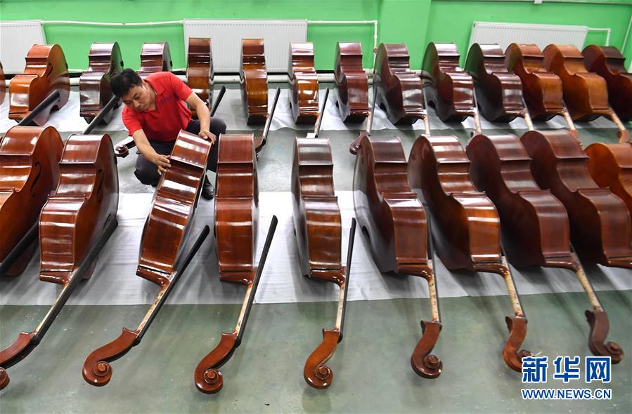 工人在河南駐馬店市確山縣提琴產業(yè)園提琴生產車間檢查提琴質量(6月23日攝)。新華社記者李嘉南攝
