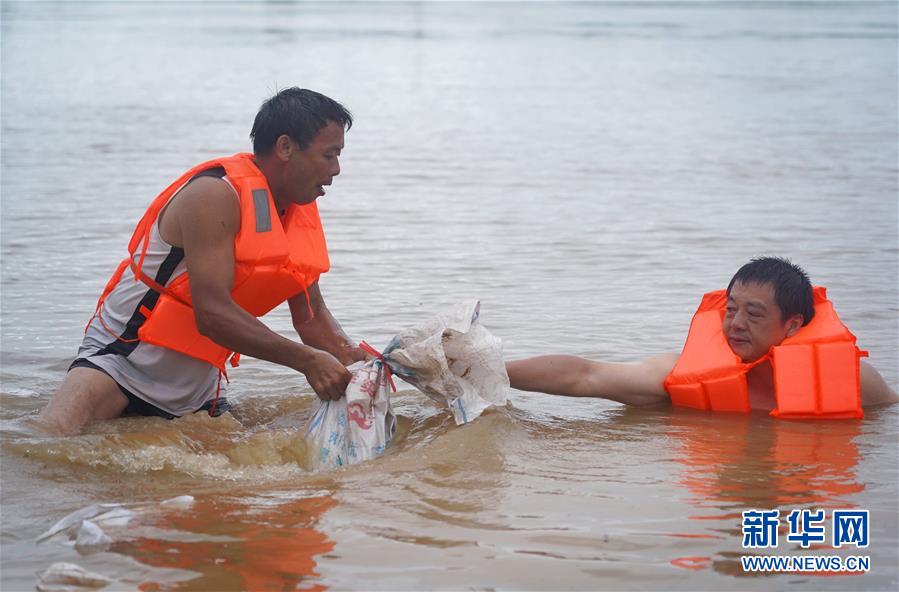 7月9日,為應(yīng)對(duì)洪峰到來,邵忠如(左)在水中加固圩堤。新華社記者萬(wàn)象攝