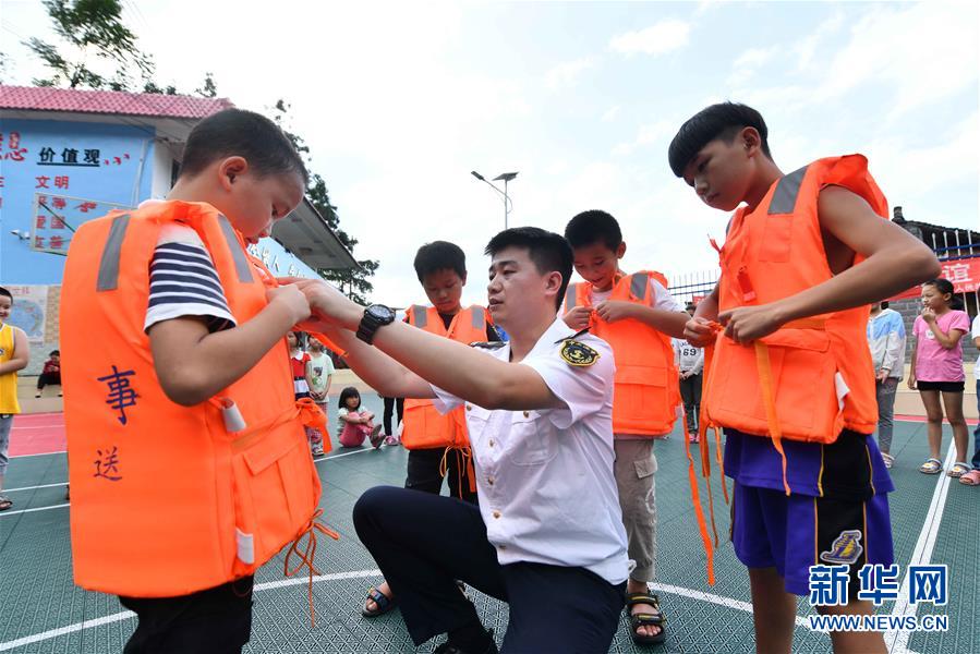 7月13日,在廣西融水苗族自治縣桿洞鄉(xiāng)黨鳩小學,融水海事處工作人員指導學生穿救生衣。當日,廣西柳州融水海事處在桿洞鄉(xiāng)黨鳩小學開展防溺水及水上交通安全知識教育活動,向?qū)W生們普及水上安全知識,并講解水上應(yīng)急救援技能。新華社記者 黃孝邦 攝