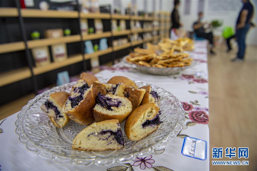 7月13日在新疆精河縣精河鎮(zhèn)馕文化產(chǎn)業(yè)示范基地拍攝的供顧客品嘗的“黑枸杞馕”。近日,新疆精河縣10萬(wàn)余畝枸杞陸續(xù)成熟,當(dāng)?shù)剞r(nóng)民搶抓農(nóng)時(shí),采收枸杞。近年來(lái),精河縣持續(xù)發(fā)展和培育枸杞“紅色產(chǎn)業(yè)鏈”,加大資金扶持力度,提升精河枸杞的品牌效應(yīng),帶動(dòng)農(nóng)民增收致富。精河縣位于新疆天山山脈北麓,準(zhǔn)噶爾盆地西南邊緣。當(dāng)?shù)厝照諘r(shí)間長(zhǎng)、晝夜溫差大且氣候干燥,有利于枸杞果實(shí)糖分和藥用成分積累。新華社記者 胡虎虎 攝