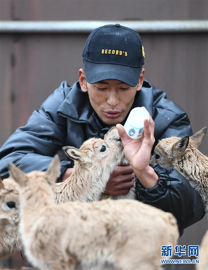 7月7日,三江源國家公園管理局長江源園區(qū)可可西里管理處卓乃湖保護(hù)站的工作人員才文多杰在給藏羚羊幼仔喂奶。