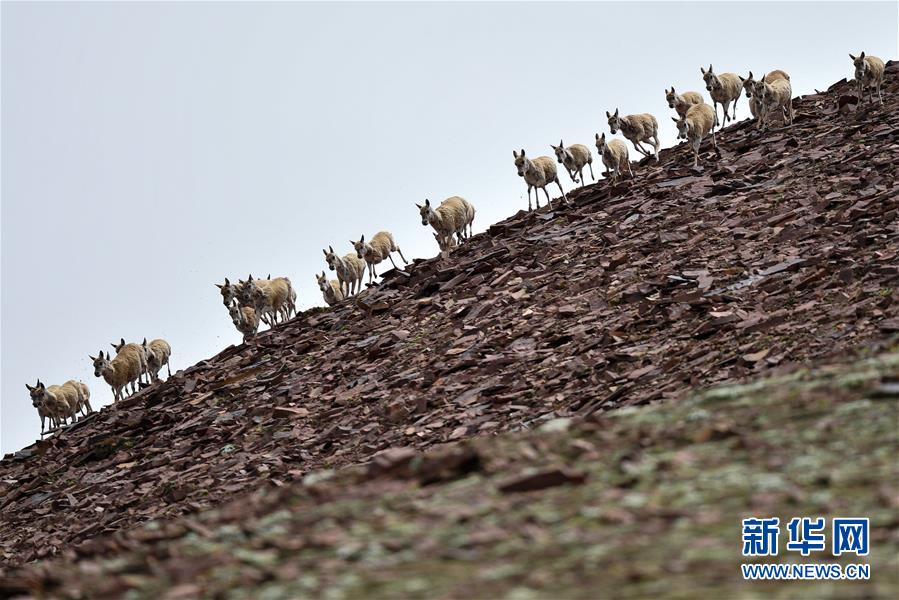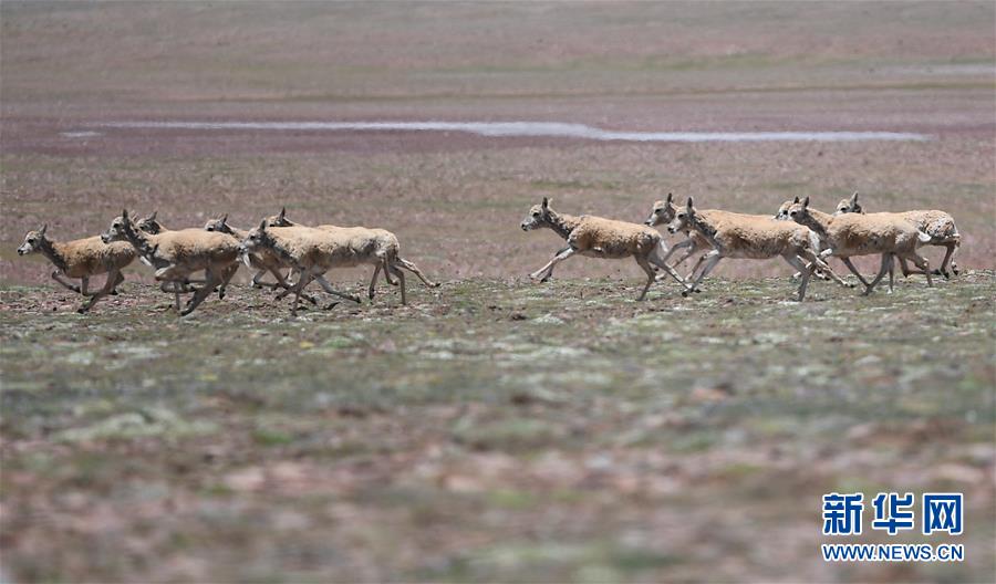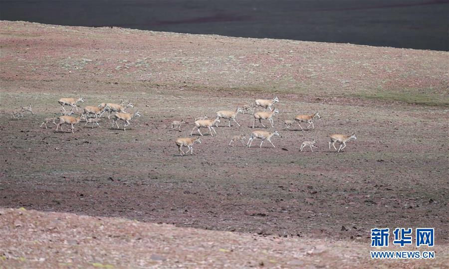 7月7日在可可西里卓乃湖區(qū)域拍攝的一群藏羚羊。目前正值藏羚羊產仔季。來自青海三江源、新疆阿爾金山、西藏羌塘等地的藏羚羊來到位于青海省可可西里腹地、被譽為“藏羚羊大產房”的卓乃湖區(qū)域產仔。新華社記者 張龍 攝