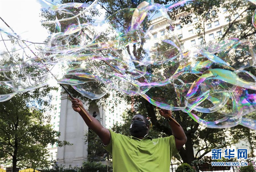 7月14日,美國紐約街頭一名戴口罩的男子表演“泡泡秀”。美國約翰斯·霍普金斯大學(xué):截至北京時間15日6時34分,全球新冠確診病例達13258016例,死亡病例為576752例。美國是全球疫情最嚴(yán)重的國家,確診病例達3416222例,死亡病例為136319例。新華社記者 王迎 攝