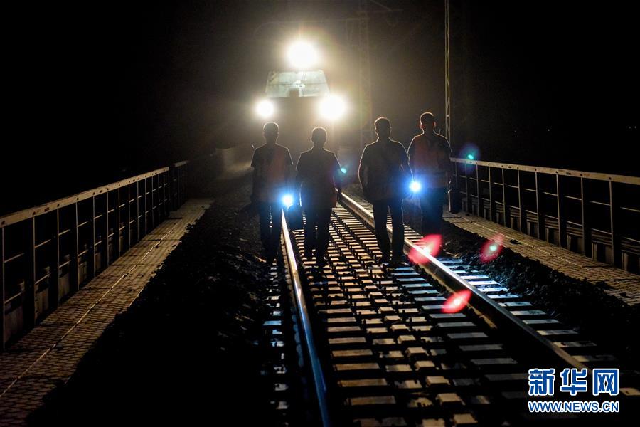 鋼軌打磨機(jī)組的技術(shù)員進(jìn)行鋼軌巡檢(7月14日攝)。新華社記者 丁磊 攝