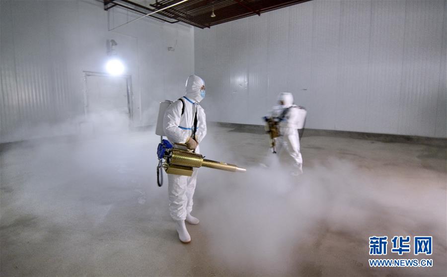 7月14日,北京二商肉類(lèi)食品集團(tuán)有限公司員工對(duì)肉類(lèi)冷藏庫(kù)房進(jìn)行全方位消毒。北京二商肉類(lèi)食品集團(tuán)有限公司是保障北京肉類(lèi)市場(chǎng)供應(yīng)的主要企業(yè)之一。新冠肺炎疫情以來(lái),企業(yè)嚴(yán)格實(shí)施北京市、農(nóng)業(yè)農(nóng)村部和中國(guó)肉類(lèi)協(xié)會(huì)的防疫要求,對(duì)進(jìn)入廠區(qū)的人員、車(chē)輛以及原料采購(gòu)、屠宰分割、產(chǎn)品加工、貯藏運(yùn)輸、廢棄物收集及污水處理等生產(chǎn)環(huán)節(jié)嚴(yán)格防疫,強(qiáng)調(diào)源頭把關(guān)徹底消毒。目前,集團(tuán)公司下屬多家生豬屠宰加工基地正常運(yùn)營(yíng),保質(zhì)保量供應(yīng)北京市場(chǎng)需求。新華社記者 李欣 攝