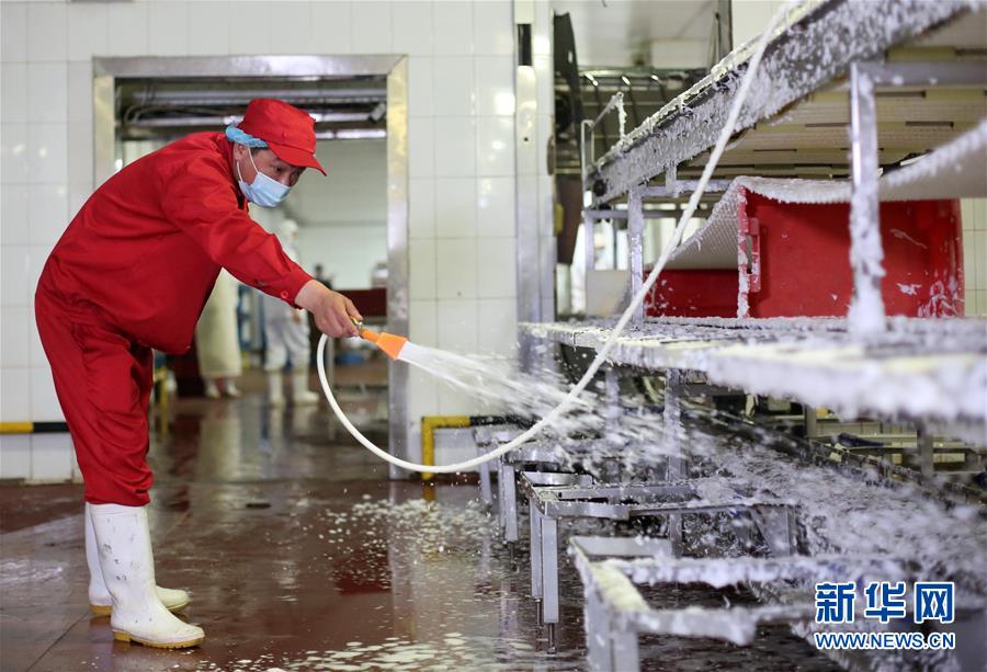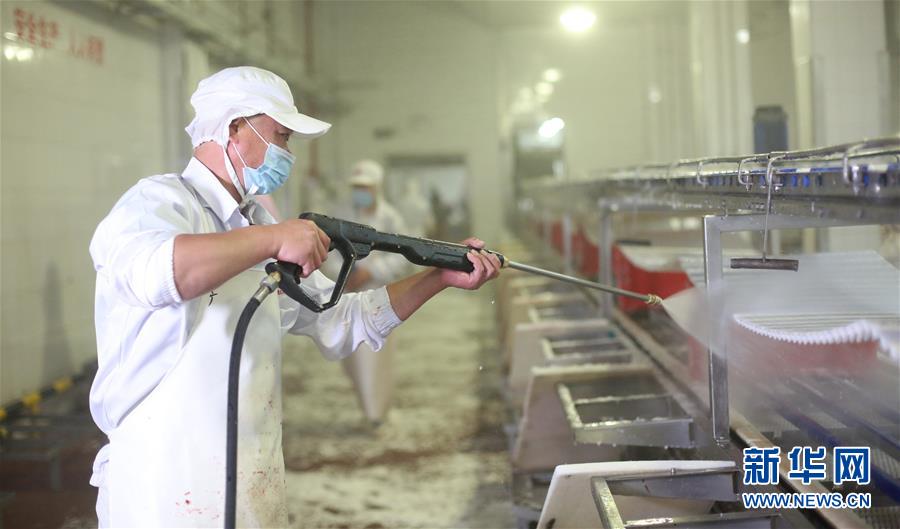 7月14日,北京二商肉類(lèi)食品集團(tuán)有限公司員工對(duì)肉類(lèi)分割流水線(xiàn)進(jìn)行清洗消毒。北京二商肉類(lèi)食品集團(tuán)有限公司是保障北京肉類(lèi)市場(chǎng)供應(yīng)的主要企業(yè)之一。新冠肺炎疫情以來(lái),企業(yè)嚴(yán)格實(shí)施北京市、農(nóng)業(yè)農(nóng)村部和中國(guó)肉類(lèi)協(xié)會(huì)的防疫要求,對(duì)進(jìn)入廠區(qū)的人員、車(chē)輛以及原料采購(gòu)、屠宰分割、產(chǎn)品加工、貯藏運(yùn)輸、廢棄物收集及污水處理等生產(chǎn)環(huán)節(jié)嚴(yán)格防疫,強(qiáng)調(diào)源頭把關(guān)徹底消毒。目前,集團(tuán)公司下屬多家生豬屠宰加工基地正常運(yùn)營(yíng),保質(zhì)保量供應(yīng)北京市場(chǎng)需求。新華社記者 李欣 攝