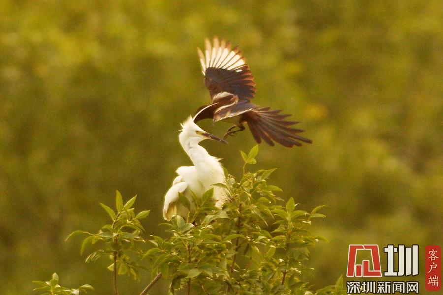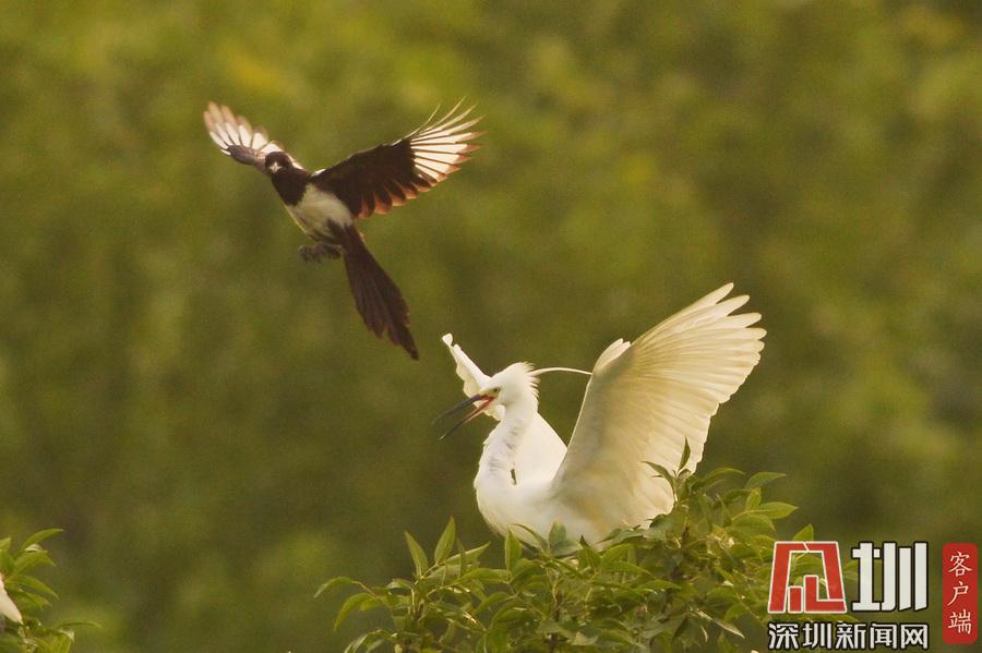 2020年7月14日,在山東省青島市城陽(yáng)區(qū)紅島街道一處林間,晚歸的白鷺與喜鵲在枝頭“蹁躚起舞”,優(yōu)美如畫。