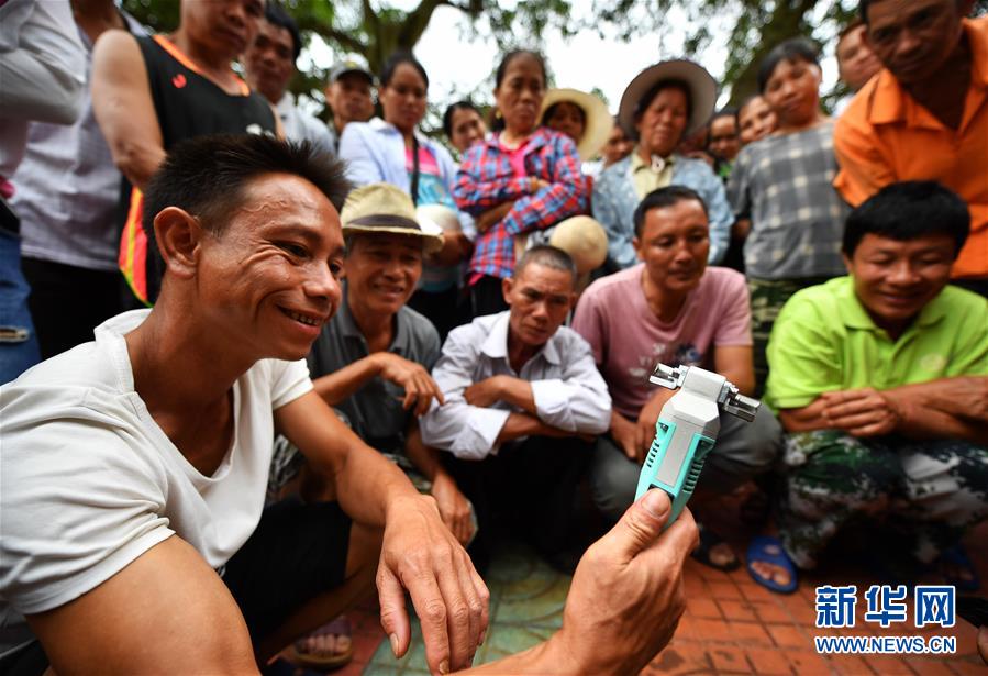 7月15日,瓊中縣什運鄉(xiāng)便文村村民在了解電動割膠刀的構(gòu)造。當日,海南瓊中黎族苗族自治縣什運鄉(xiāng)為542名貧困戶免費發(fā)放電動割膠刀,割膠刀研發(fā)單位為貧困戶提供使用技能培訓。海南有著豐富的天然橡膠資源,但傳統(tǒng)膠刀的割膠技術(shù)要求高,農(nóng)民難以掌握,許多膠林閑置。電動割膠刀使割膠簡單易學,幫助村民提高割膠效率,助力脫貧增收。新華社記者郭程攝